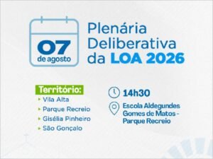 A Prefeitura do Crato, por meio da Secretaria de Planejamento e Gestão, dá início às Plenárias Deliberativas da Lei Orçamentária Anual – LOA 2026, dentro do Orçamento Participativo, hoje, 7, às 14h30, na Escola Aldegundes Gomes de Matos, abrangendo o território da Vila Alta, Parque Recreio, Gisélia Pinheiro e São Gonçalo. Esse território será contemplado com R$ 545 mil.