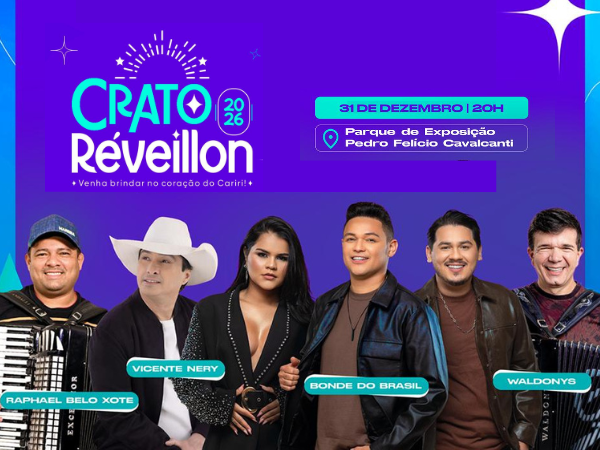 A Prefeitura do Crato, por meio da Secretaria Municipal de Turismo, celebra a chegada do novo ano com o “Crato Réveillon 2026: Venha brindar no coração do Cariri”, ao som das bandas Bonde do Brasil, Vicente Nery, Raphael Belo Xote e Waldonys, resgatando a tradição de comemorar a virada do ano em grande estilo e gratuitamente.