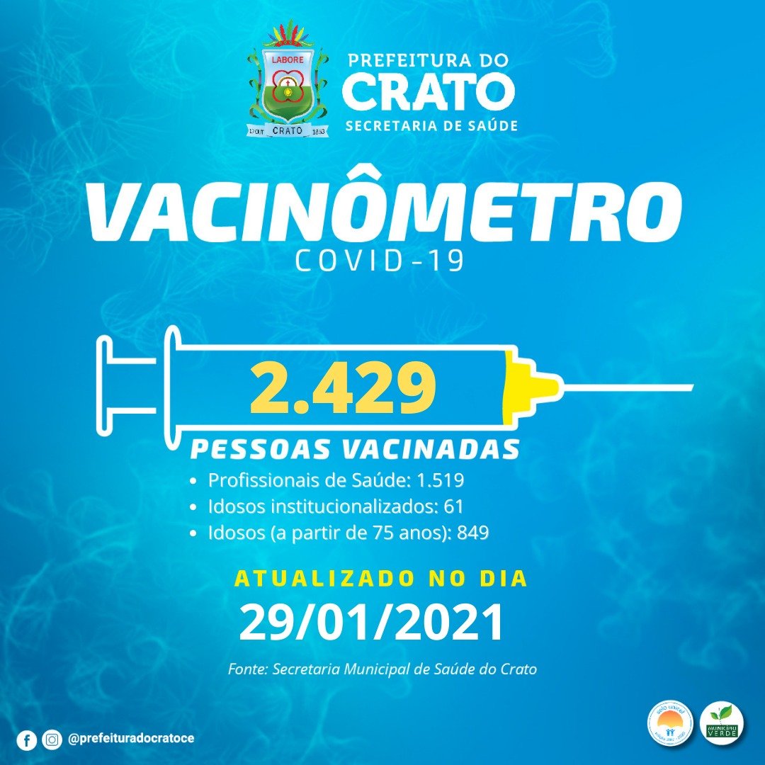 A Secretaria de Saúde do Crato finalizou a semana completando 2.429 cratenses recebendo a primeira dose da vacina contra COVID-19. Do total, 1519 ...